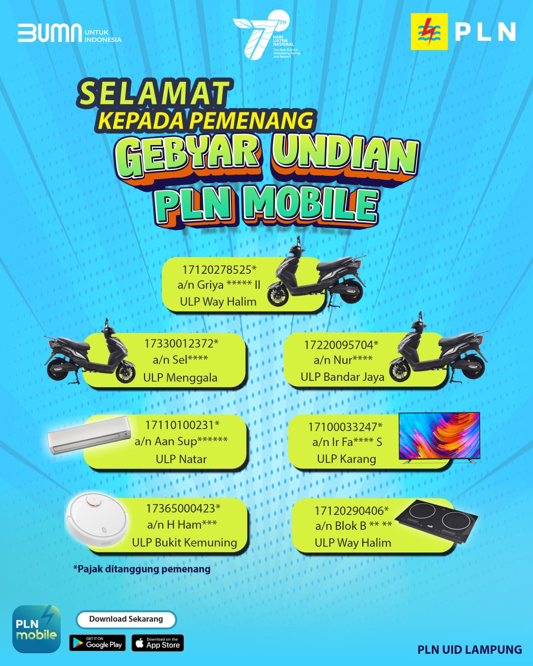 Daftar pemenang Gebyar Undian PLN Mobile telah sah ditetapkan berdasarkan pengundian yang dilakukan adalah sebagai berikut:
