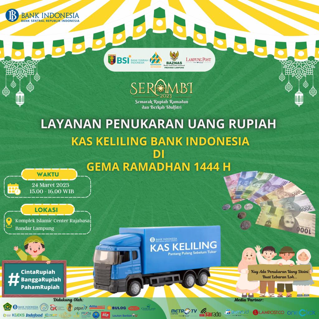 Secara nasional, Bank Indonesia pada tahun 2023 menyiapkan uang tunai senilai Rp195 triliun untuk memenuhi kebutuhan uang tunai layak edar selama periode Ramadhan dan Idul Fitri 1444 H, serta membuka titik layanan di 5.066 titik di seluruh Indonesia, bertambah 377 titik atau naik sebesar 8,22% (yoy) dari tahun 2022. Untuk memenuhi kebutuhan uang rupiah di wilayah Provinsi Lampung, Bank Indonesia menyiapkan uang kartal sebesar Rp4,5 triliun yang layak edar selama periode Ramadhan dan Idul Fitri 2023. Jumlah uang yang disediakan tersebut meningkat sebesar 20,9% jika dibandingkan dengan tahun sebelumnya sebesar Rp 3,7 triliun. Hal ini merupakan wujud komitmen Bank Indonesia bersama perbankan dalam memenuhi kebutuhan uang layak edar bagi masyarakat di wilayah Provinsi Lampung.