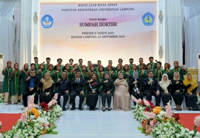 Lampung,- (WS99) Fakultas Kedokteran (FK) Universitas Lampung (Unila) menggelar prosesi sumpah dokter periode II tahun 2023 di gedung serbaguna kampus setempat, Jumat, 22 September 2023.