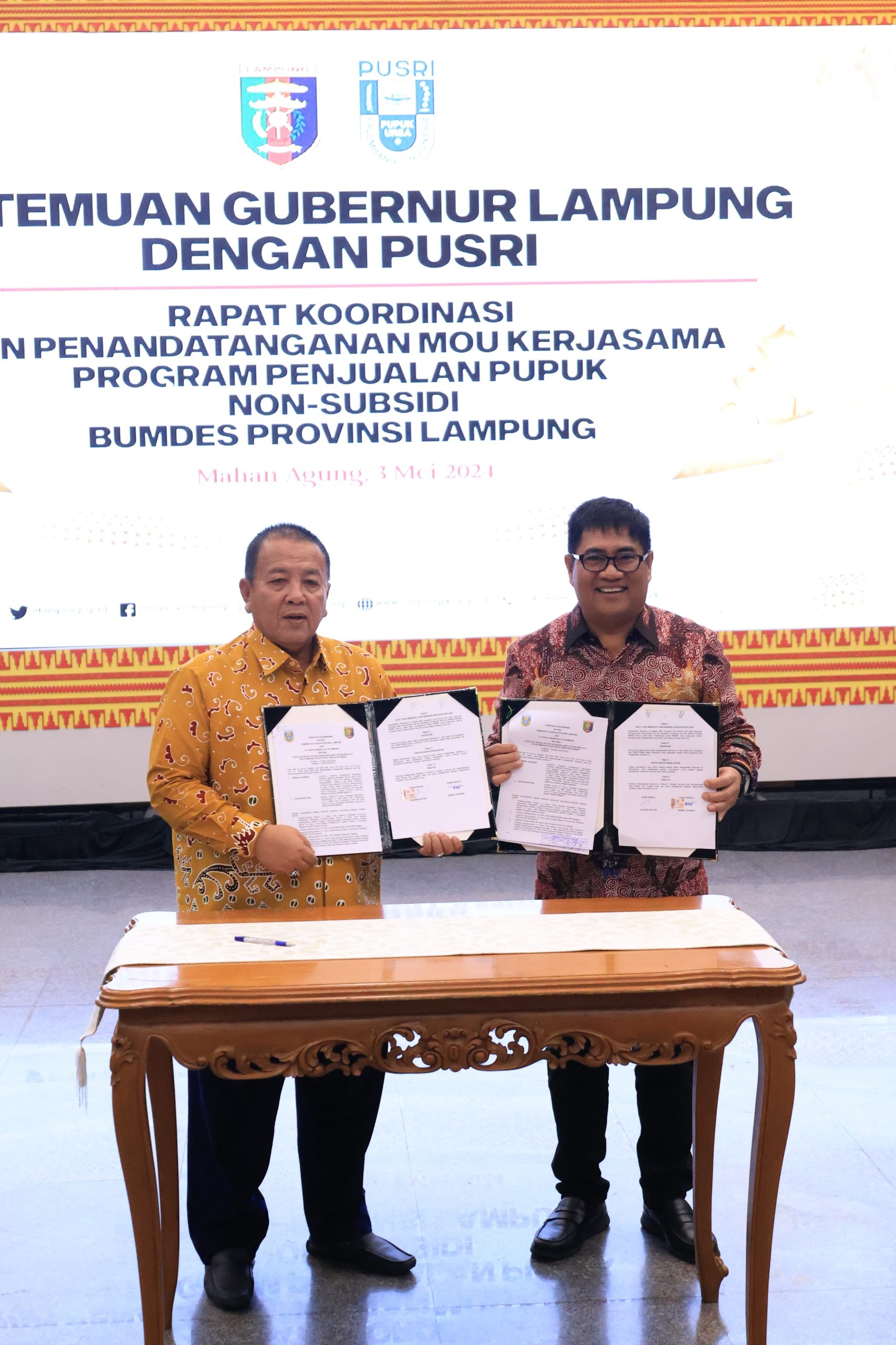 BANDARLAMPUNG,- (WS99.Net) Gubernur Lampung Arinal Djunaidi melakukan penandatanganan Memorandum of Understanding (MoU) bersama PT Pupuk Sriwidjaja Palembang (Pusri), terkait fasilitas kepada petani pengguna Kartu Petani Berjaya (KPB) untuk mendapatkan pupuk urea non-subsidi, di Mahan Agung, Bandar Lampung, Jum’at (3/5/2024) malam.