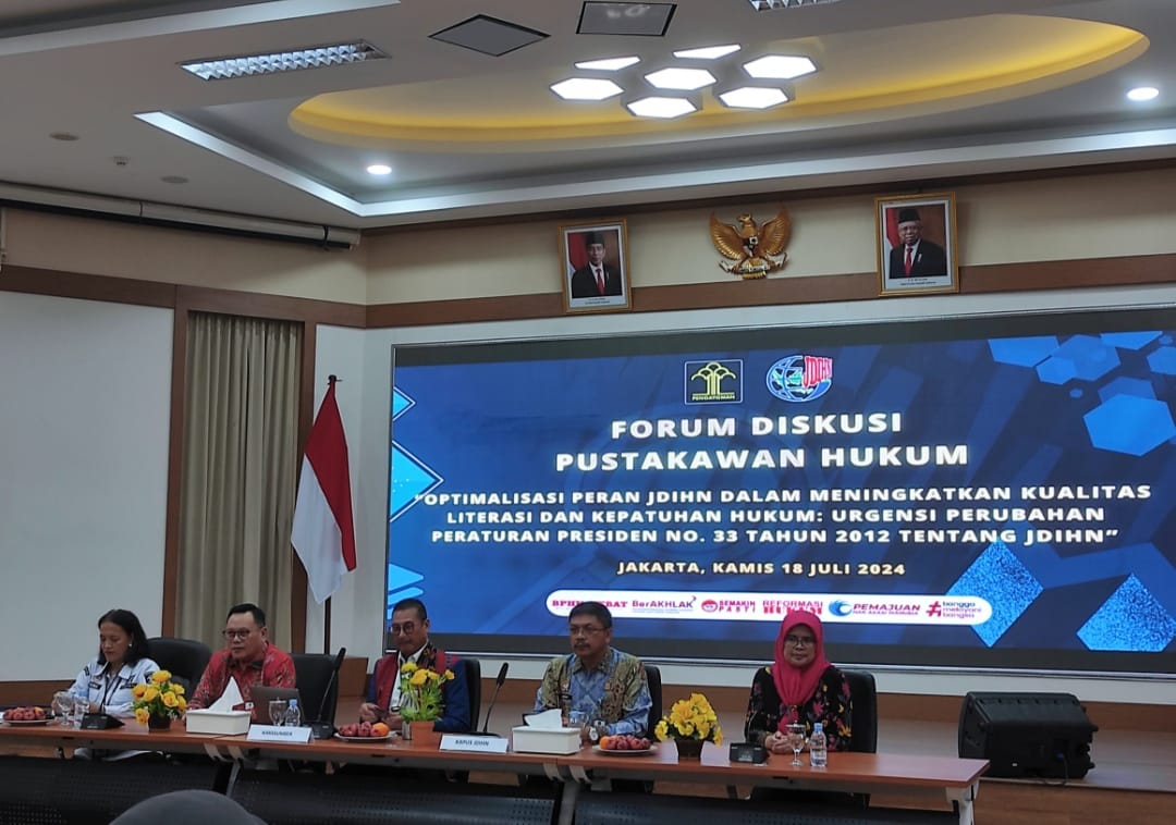 Forum Diskusi Pustakawan Hukum ini dihadiri oleh anggota JDIHN seluruh Indonesia dan dilaksanakan di Badan Pembinaan Informasi Hukum Nasional (BPIHN) di Jakarta Timur pada hari Kamis tanggal 18 Juli 2024.