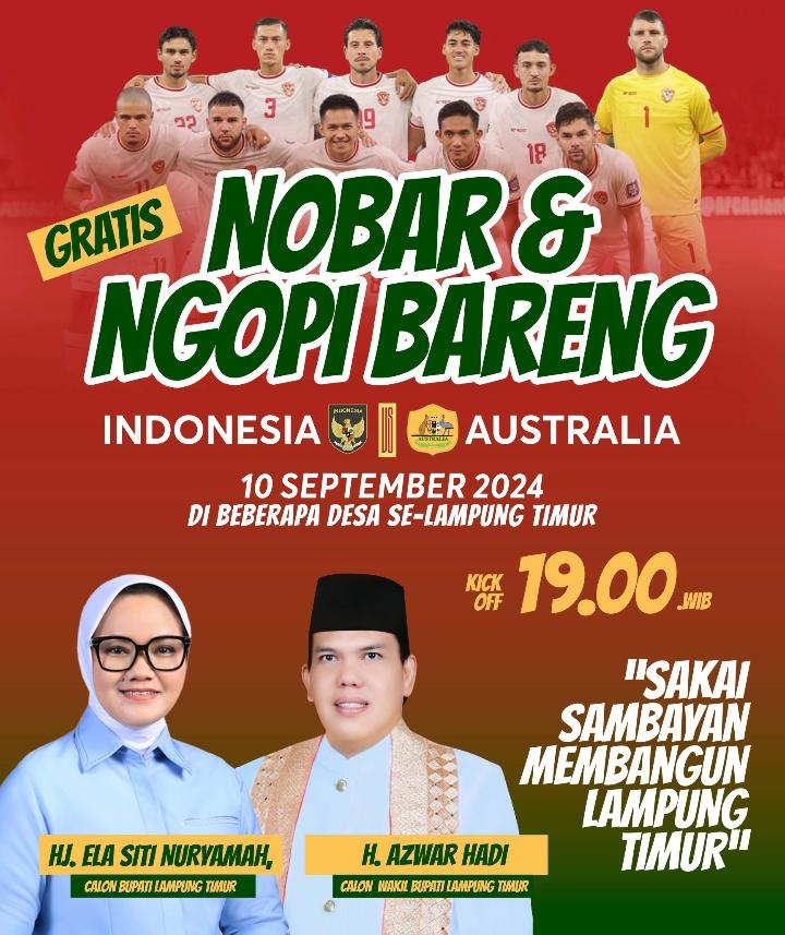 Lampung,- (WS99.Net) Pasangan Calon Bupati Hj Ela Siti Nuryamah dan Wakil Bupati Lamtim Hi Azwar Hadi mengadakan nonton bareng (Nobar) Tim Nasional (Timnas) Indonesia melawan Timnas Australia, di beberapa desa Se-kabupaten Lampung Timur (Lamtim), yang akan berlangsung pada pukul 19.00 WIB, selasa (10/09/24).
