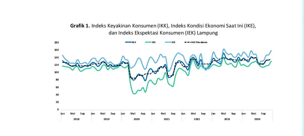 Lampung (BI Lampung) yang menunjukkan bahwa Indeks Keyakinan Konsumen (IKK) meningkat dari sebelumnya 133,8 menjadi 144,8, berada pada level optimis (>100). Optimisme konsumen Provinsi Lampung tersebut sejalan dengan peningkatan IKK Nasional pada Desember 2024 yang sebesar 127,7 dari sebelumnya 125,9 pada bulan November 2024.