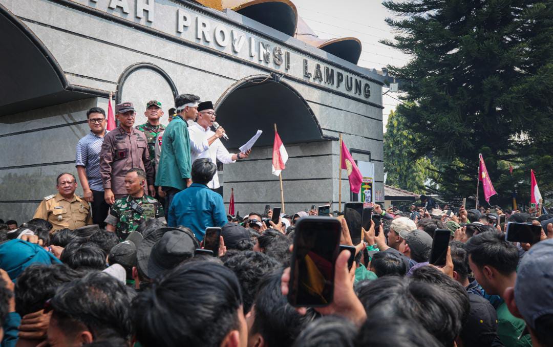 Bandarlampung, – Suara Rakyat Didengar, Gubernur Lampung Rahmat Mirzani Djausal bersama jajaran Forum Koordinasi Pimpinan Daerah (Forkopimda) Provinsi Lampung menyambut ribuan massa demonstrasi dengan aksi damai di depan gerbang kantor Pemerintah Provinsi Lampung, Senin (1/9/2025).