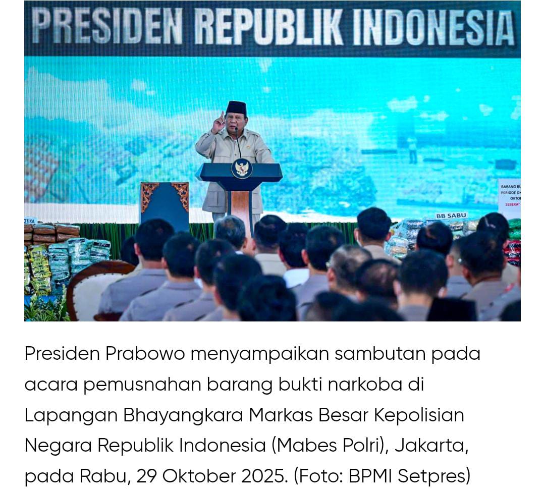 “Kalau sumber daya kita bocor, darah kita hilang. Kalau hilangnya terus-menerus, tahun-tahun-tahun, bertahun-tahun, berdekade-dekade, sudah pasti tidak usah orang pinter, tidak usah S3, untuk di ujungnya kita akan gagal sebagai suatu bangsa,” tegas Presiden Prabowo dalam sambutannya pada acara pemusnahan barang bukti narkoba di Lapangan Bhayangkara Markas Besar Kepolisian Negara Republik Indonesia (Mabes Polri), Jakarta, pada Rabu, 29 Oktober 2025.