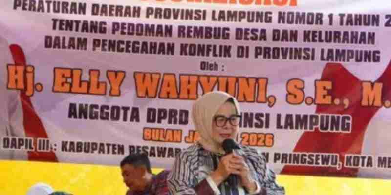 PESAWARAN – Sekretaris Komisi V DPRD Provinsi Lampung, Elly Wahyuni, menggelar Sosialisasi Peraturan Daerah (Sosper) Perda Provinsi Lampung Nomor 1 Tahun 2016 tentang Pedoman Rembug Desa dan Kelurahan dalam Pencegahan Konflik di Provinsi Lampung. Kegiatan tersebut berlangsung di Dusun Pahumungan, Desa Way Kepayang, Kecamatan Kedondong, Kabupaten Pesawaran, Sabtu (24/1/2026).