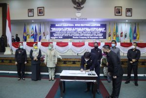 Bandar Lampung,- Gubernur Lampung Arinal Djunaidi dan Ketua DPRD Provinsi Lampung Mingrum Gumay bersama 4 Wakil Ketua DPRD menandatangani Rancangan Peraturan Daerah